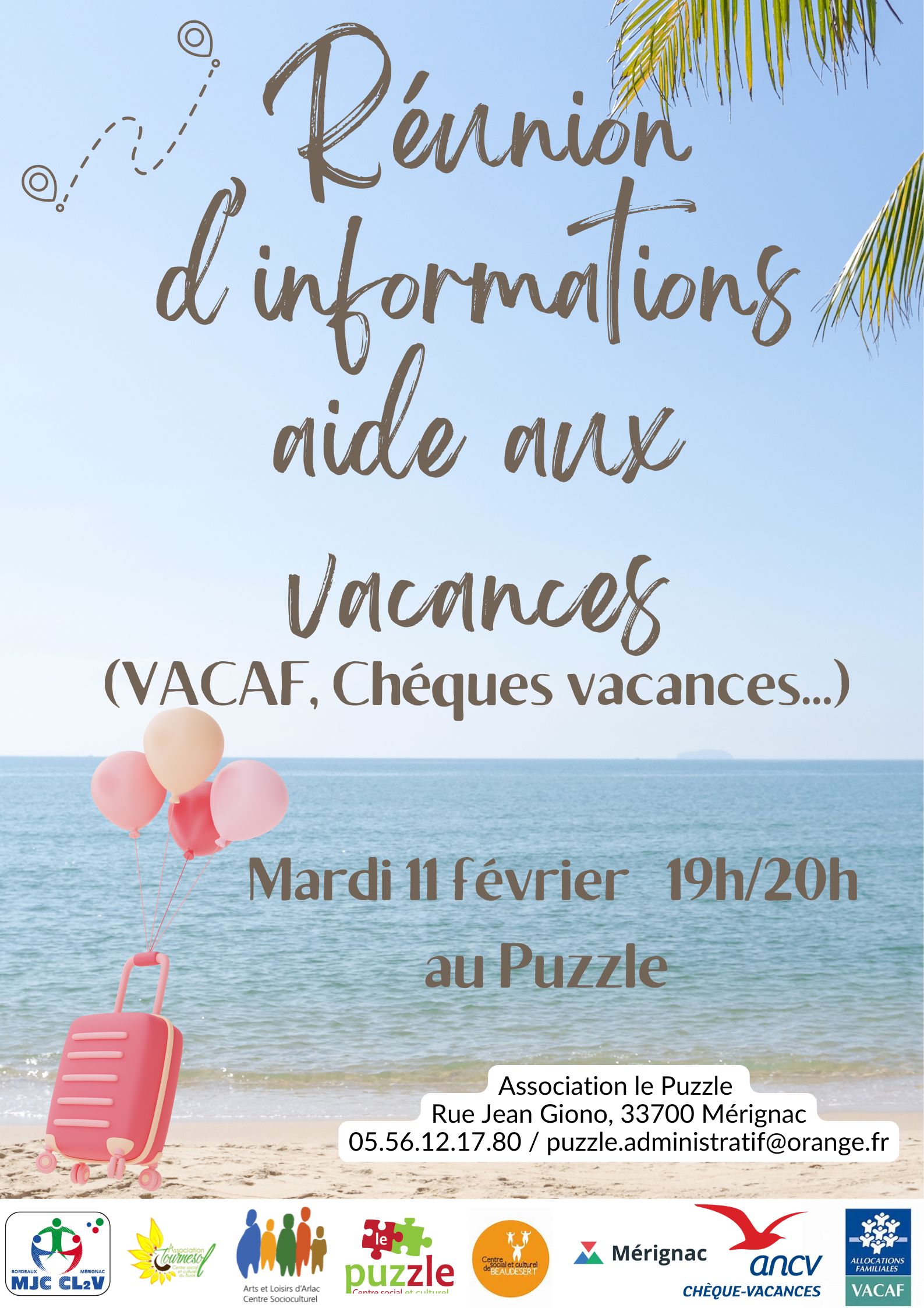 Le Puzzle rue Jean Giono, MERIGNACVous souhaitez partir en vacances? Vous voulez vous renseigner sur les aides possibles? Venez à cette réunion où on vous explique tout. VACAF n’aura plus de secret pour vous! ( pas de garde d'enfants organisée)