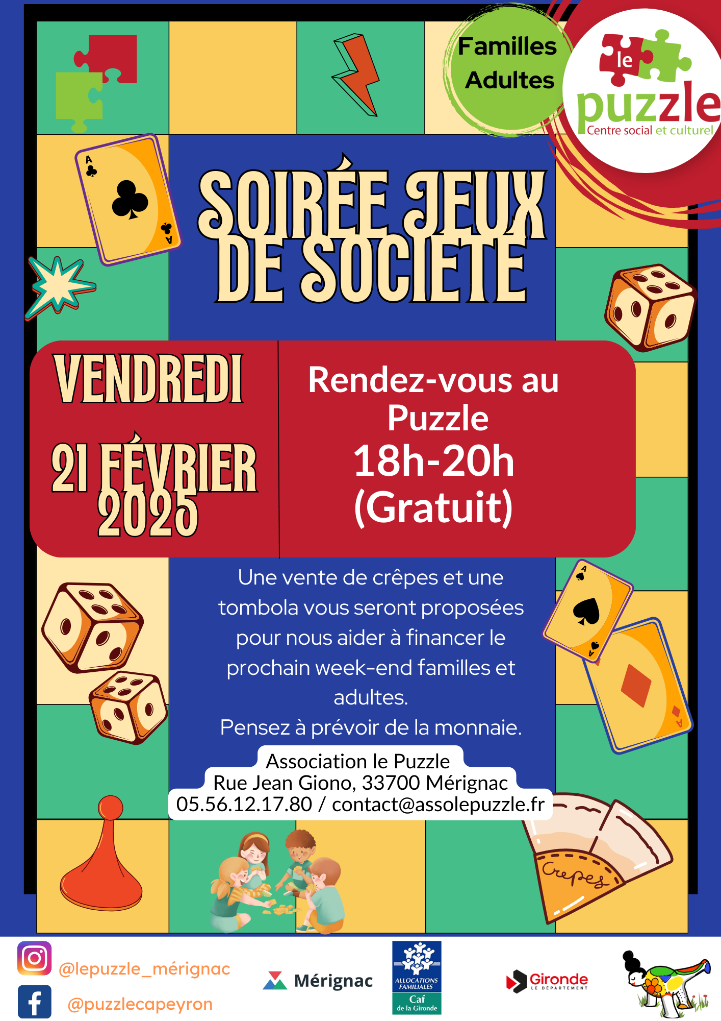 Le Puzzle rue Jean Giono, MERIGNACDe 18h00 à 20h00: quoi de mieux en cette soirée d'hiver qu'une soirée jeux de société entre voisins? Des boissons et crêpes seront en vente lors de la soirée. Dès 4 ans De 14h00 à 16h00 confection de crêpes pour une action d'auto-financement.